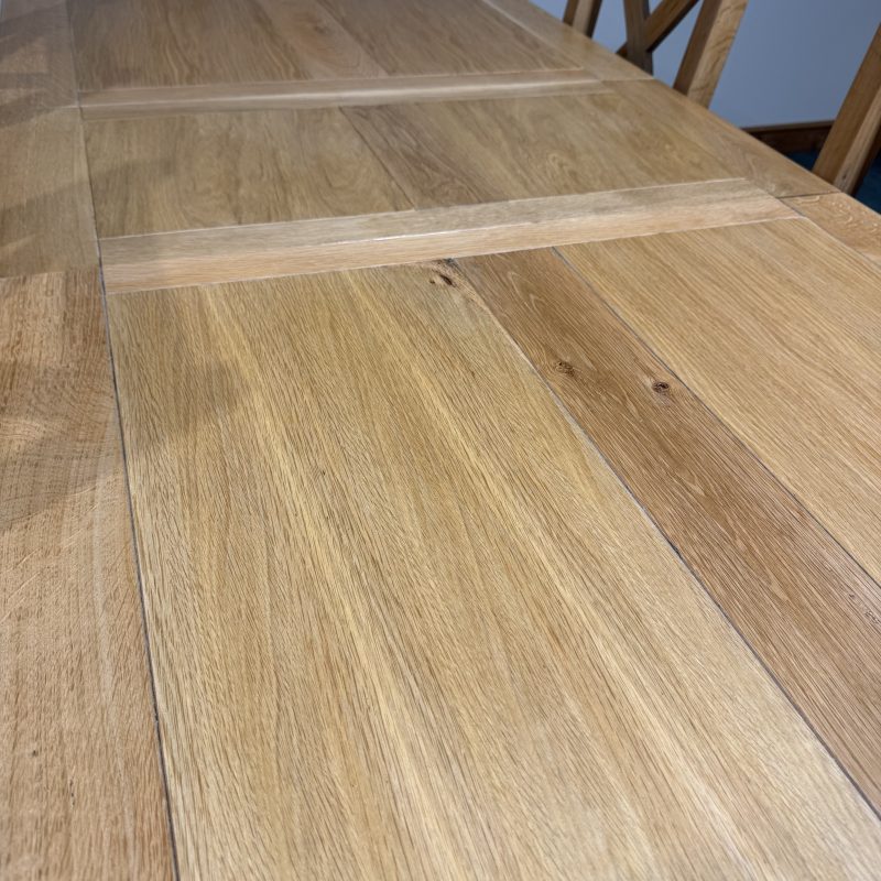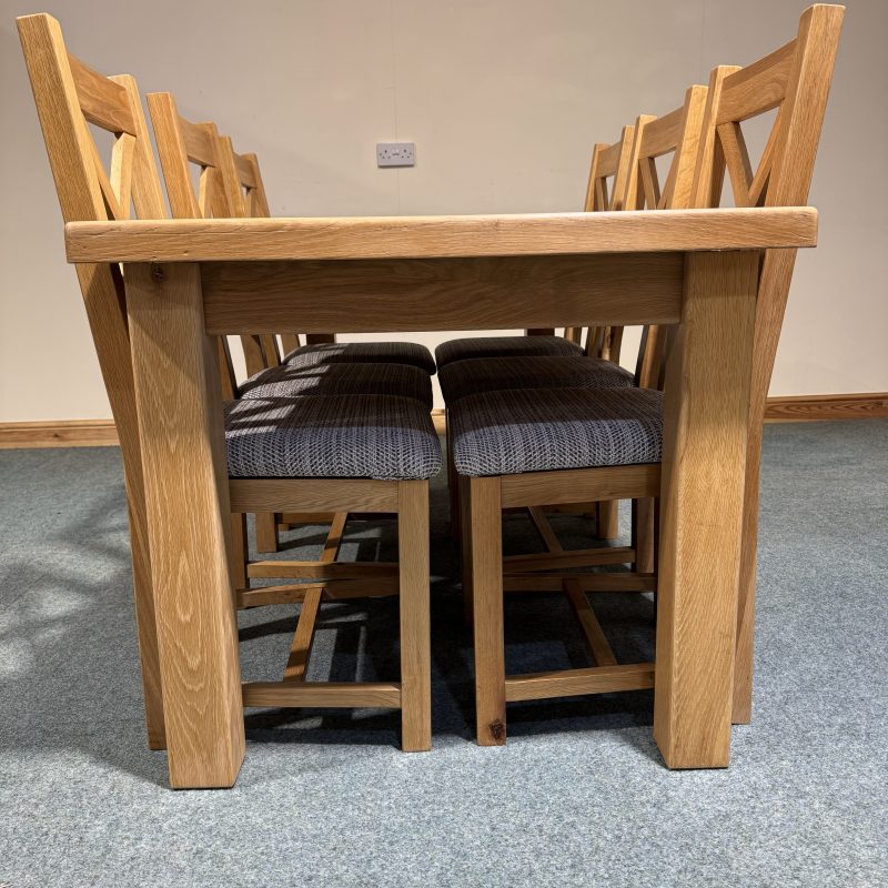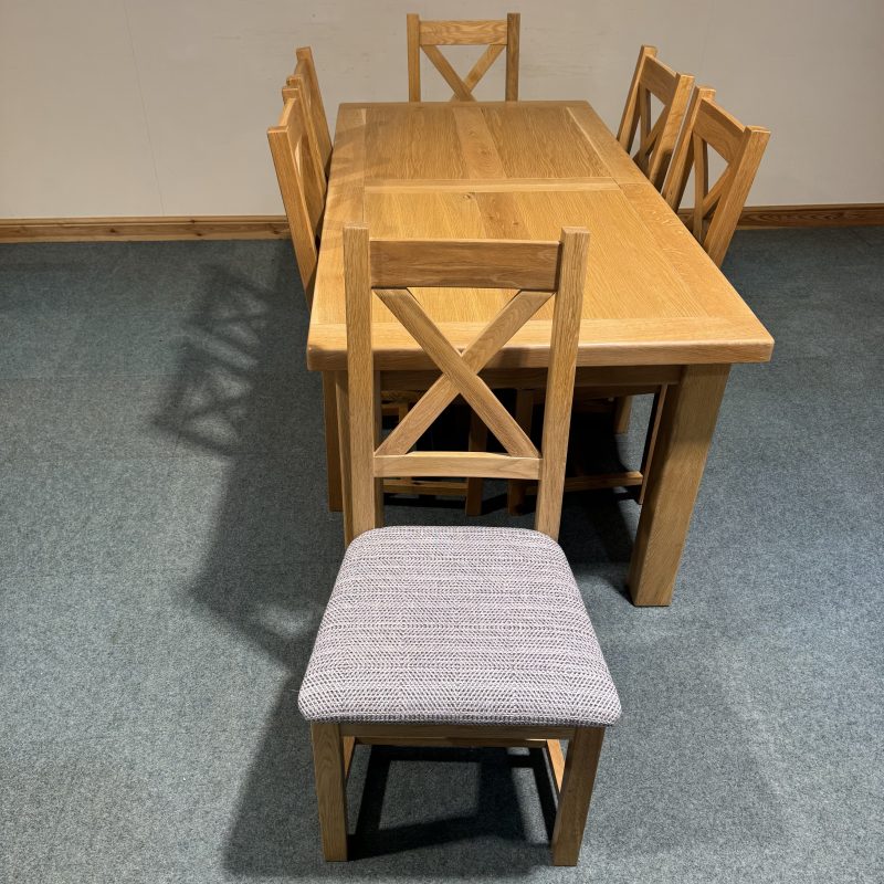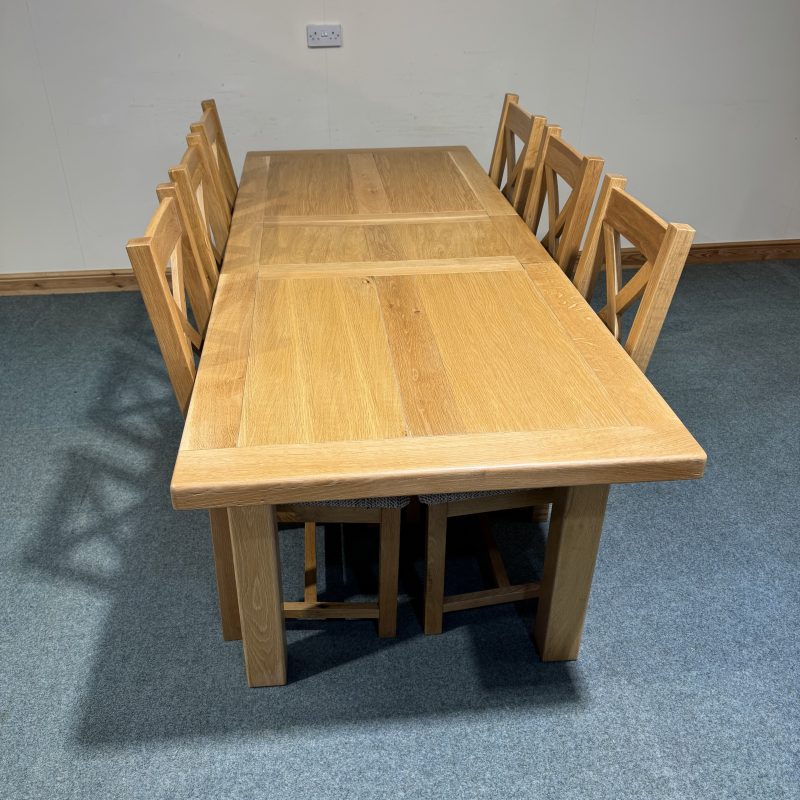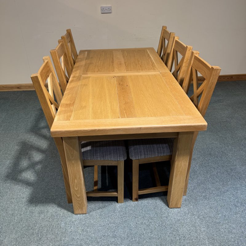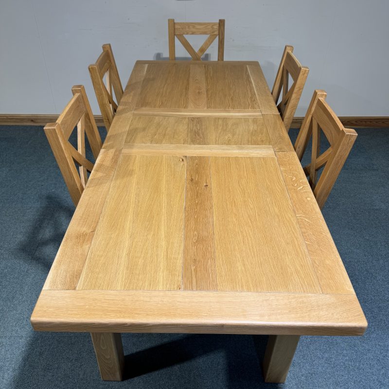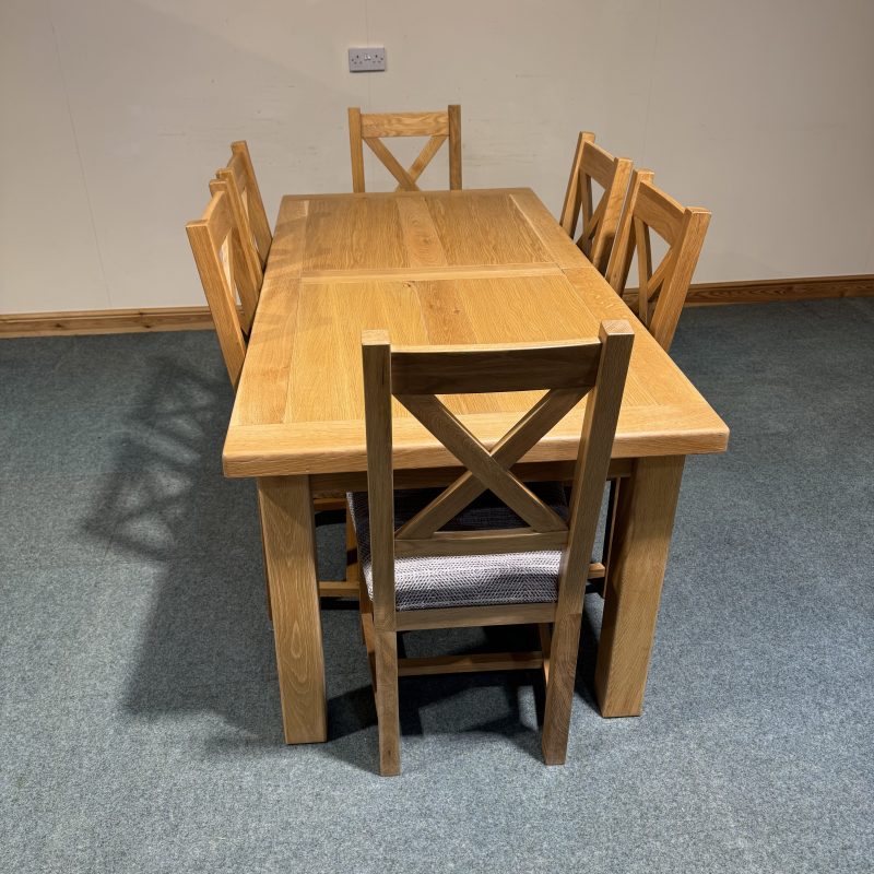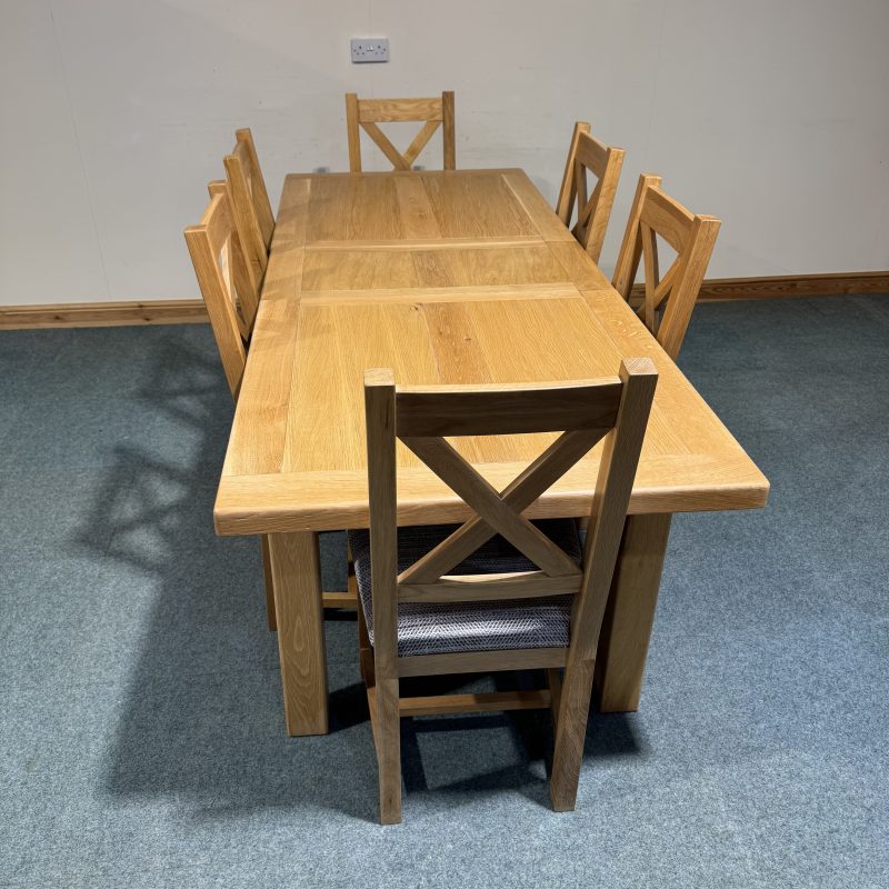 This large, oak set has gorgeous wood grain and has a modern look compared to some of the other sets we offer. The table is the ideal size to seat 6 comfortably but with the addition of the extra leaf you can seat 8!