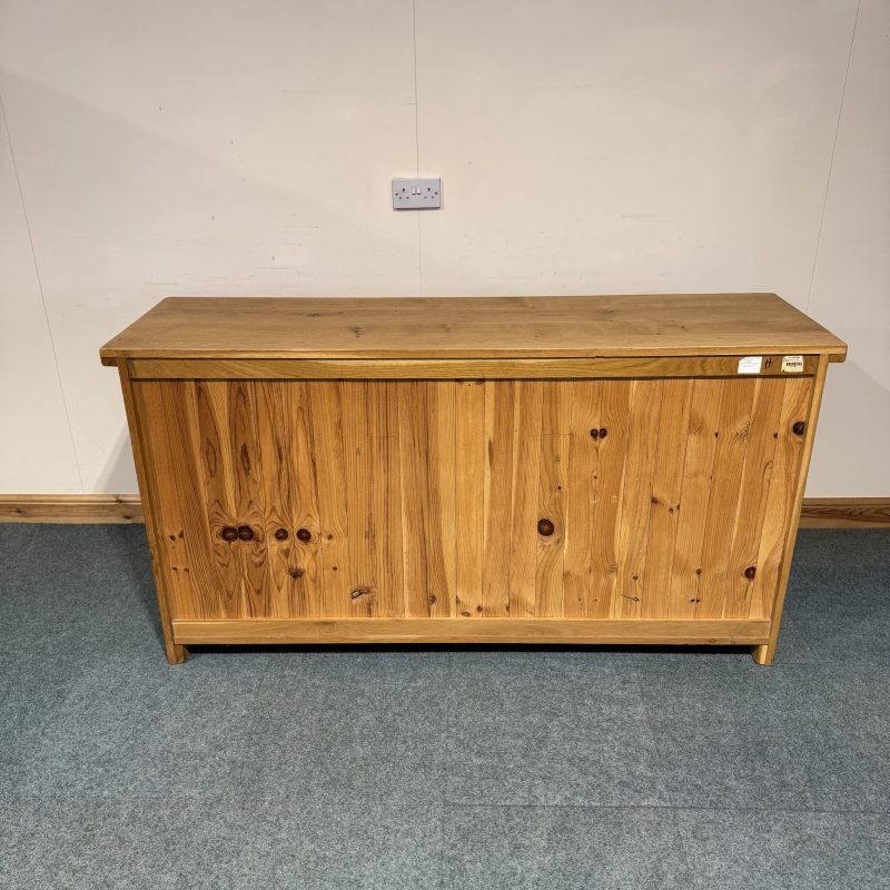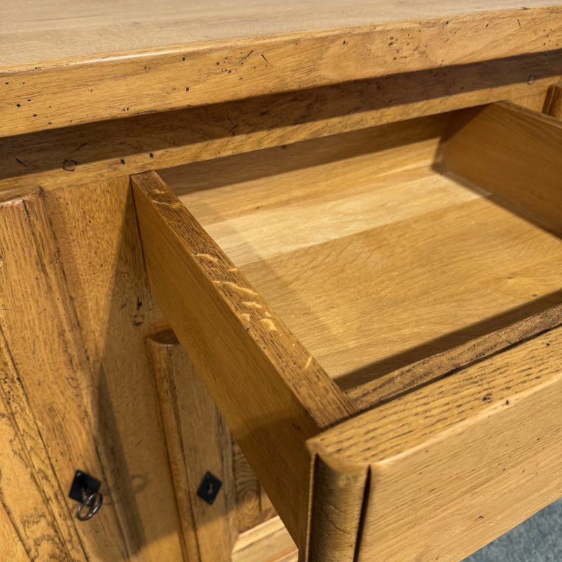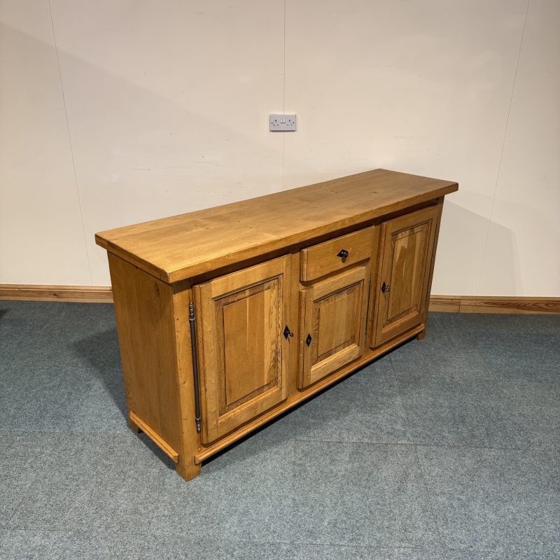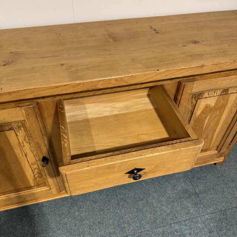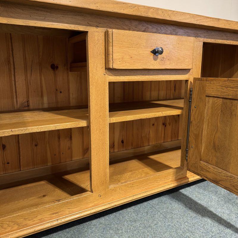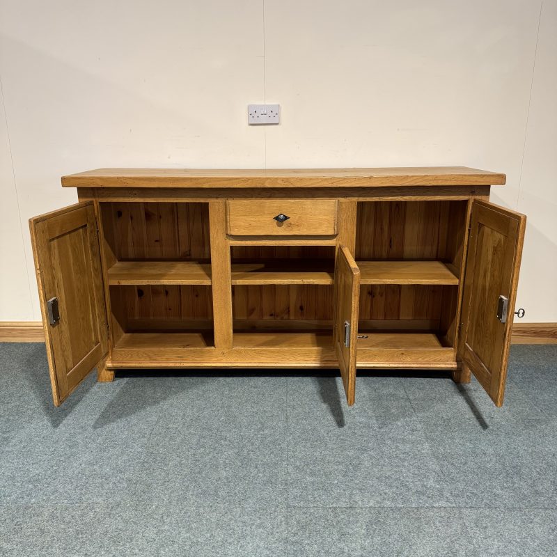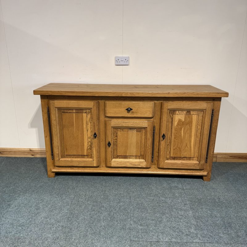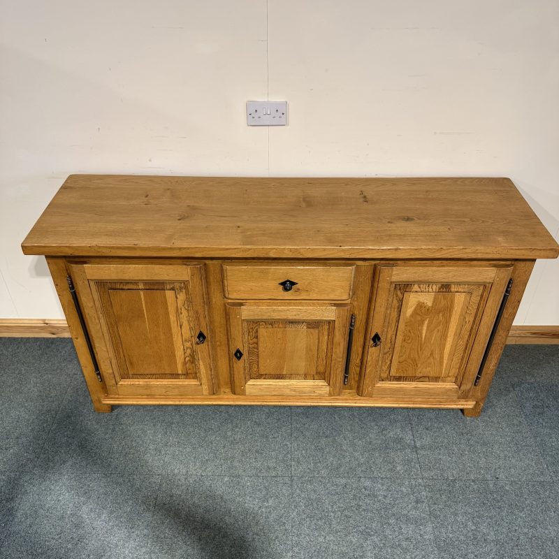 This large, rustic solid oak sideboard has quality raised door panels and gorgeous wood grain throughout. Large door hinges also give it a unique look.