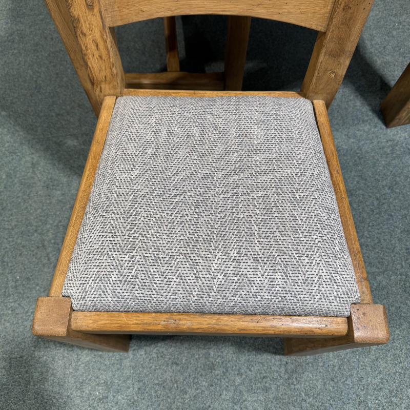 On this table and the chairs we removed the old finish fully and refinished with a Dark Oak Briwax. The chairs also had the old seat covers removed and have been recovered in the light blue material as seen.