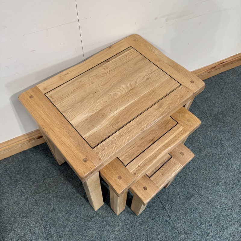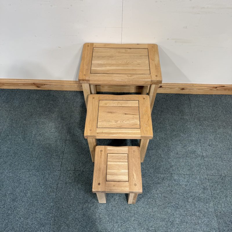 This medium sized, solid oak nest of tables has 3 tables going down in size. Very useful to get out for little side tables on occasions and then neatly pop away when not needed.