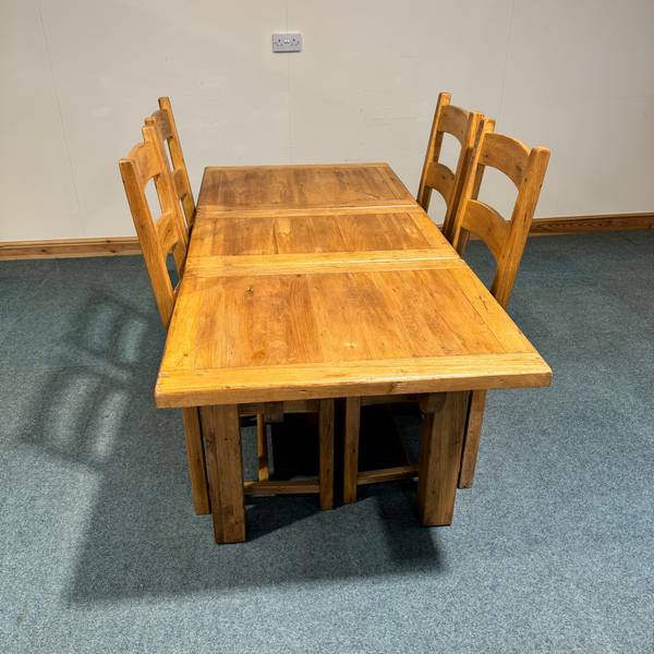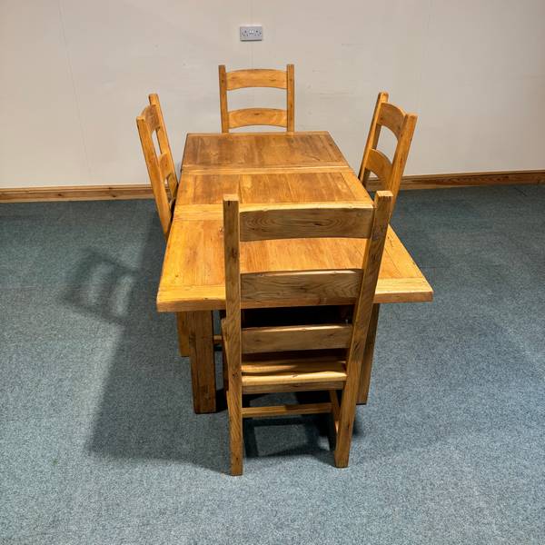 This small, solid oak set is distressed. By “distressed” we mean the manufacturer has added any of the following such as false woodworm, scratches, marks and even dents. This is commonly only used on top quality pieces because it takes a lot of work and skill to keep within the fine line of the piece looking rustic and aged which is the aim or actually just damaged.