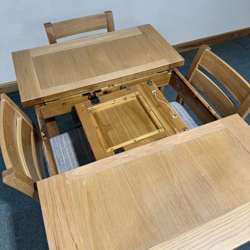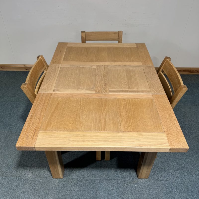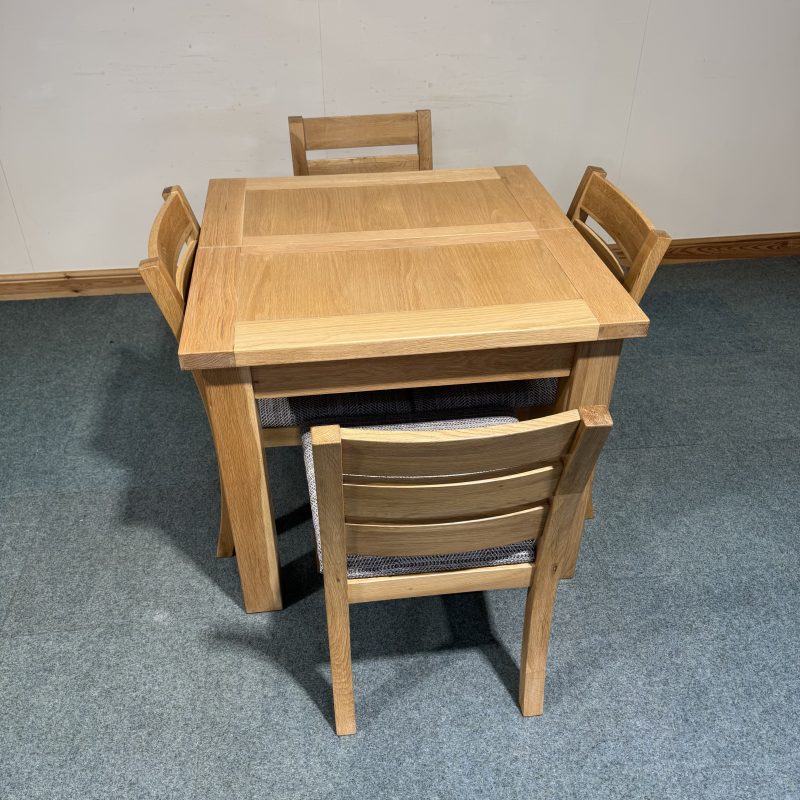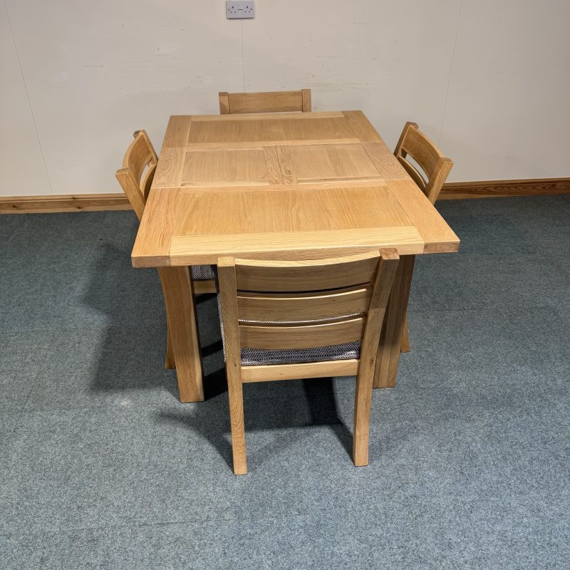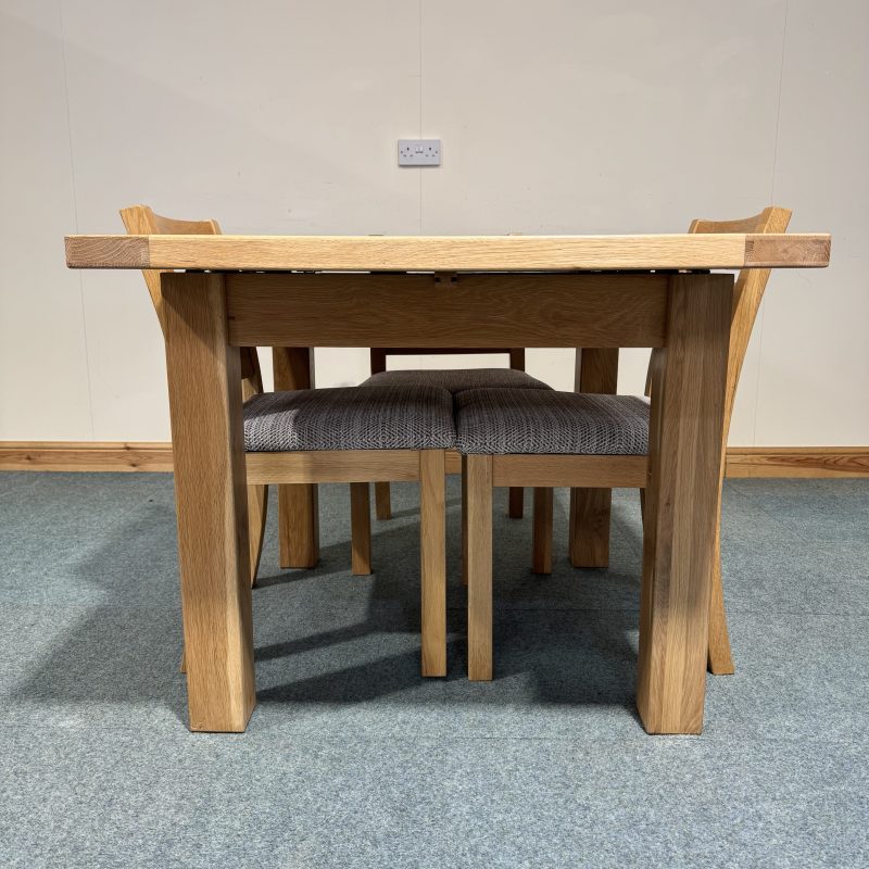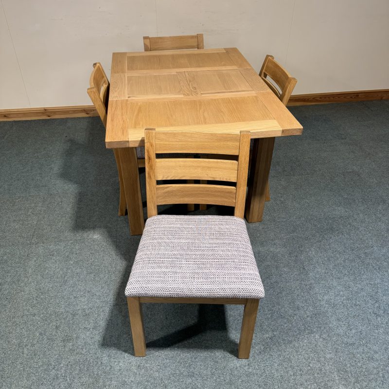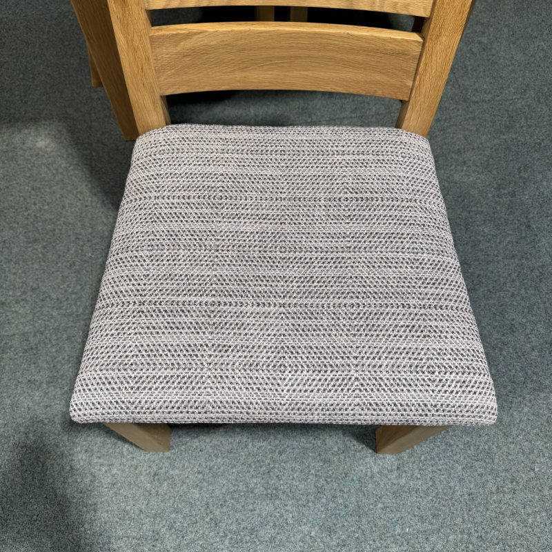 • Chairs are Oak low ladderbacks with light grey padded seats.