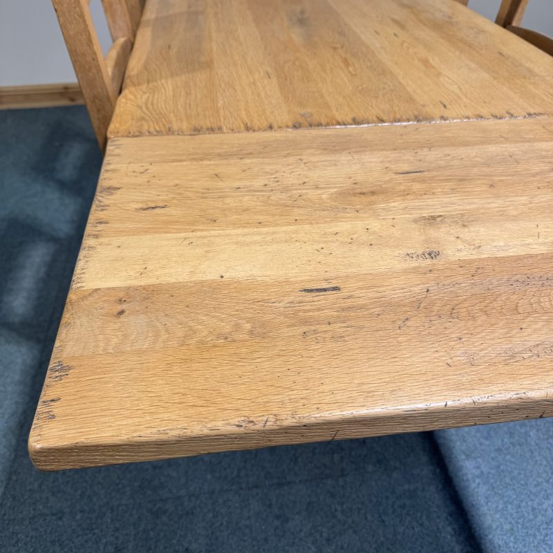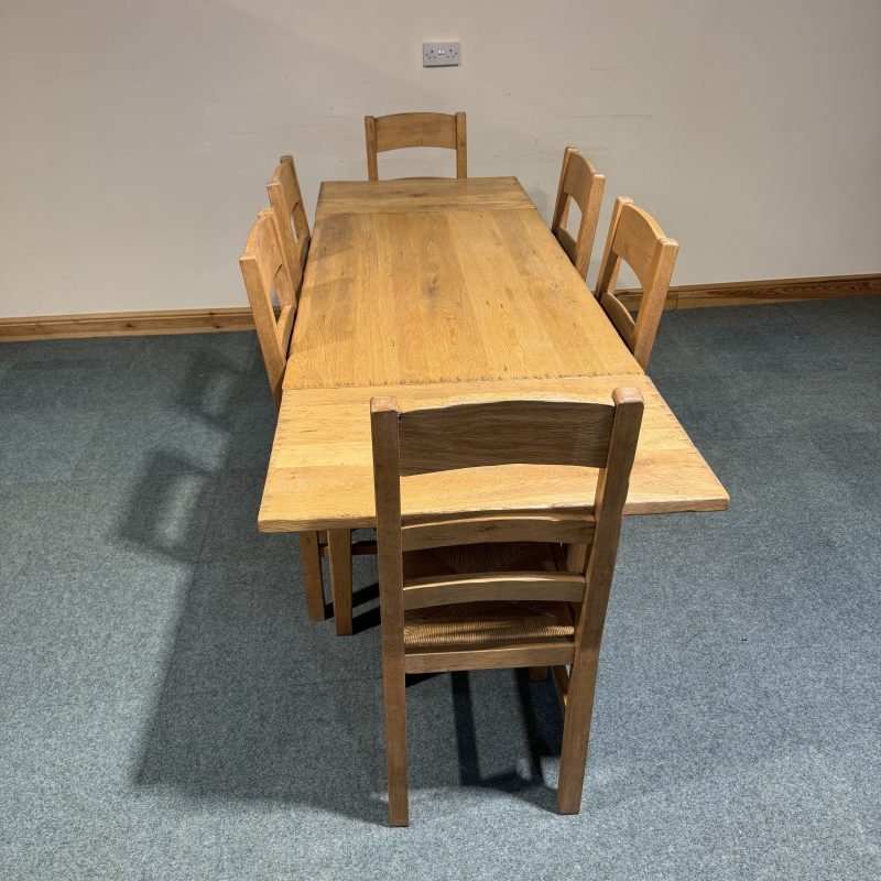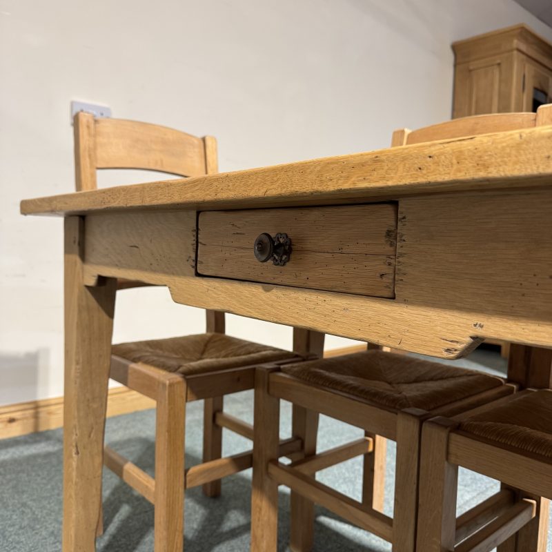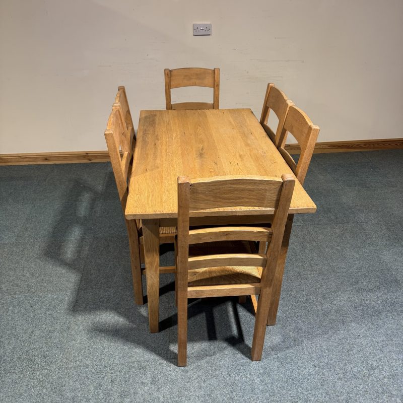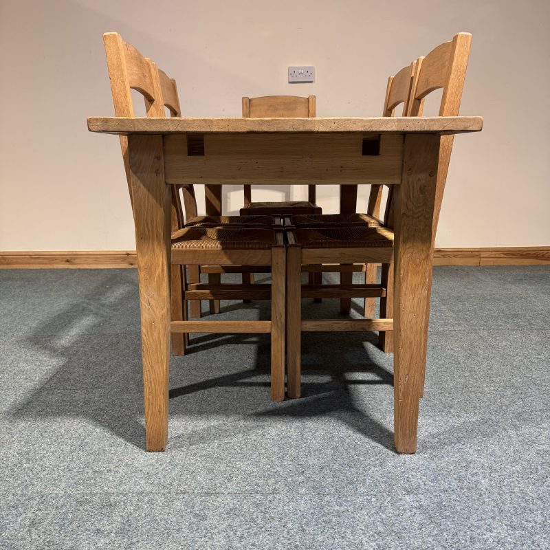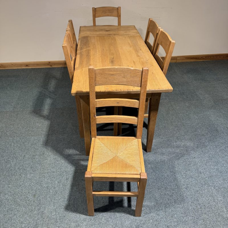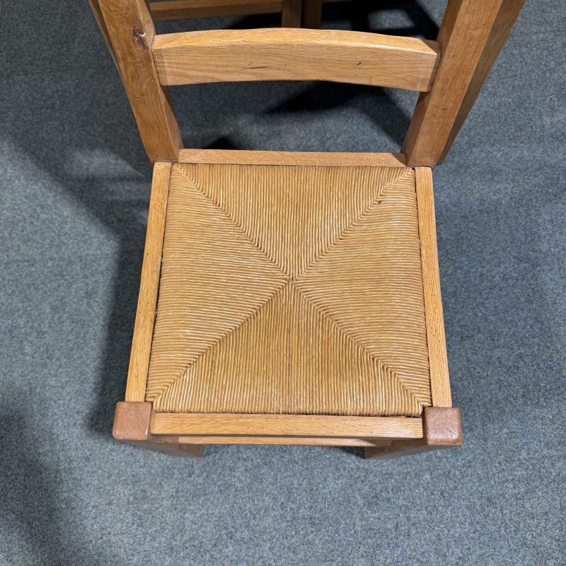 • Chairs are low, solid oak ladderbacks with rush seats.