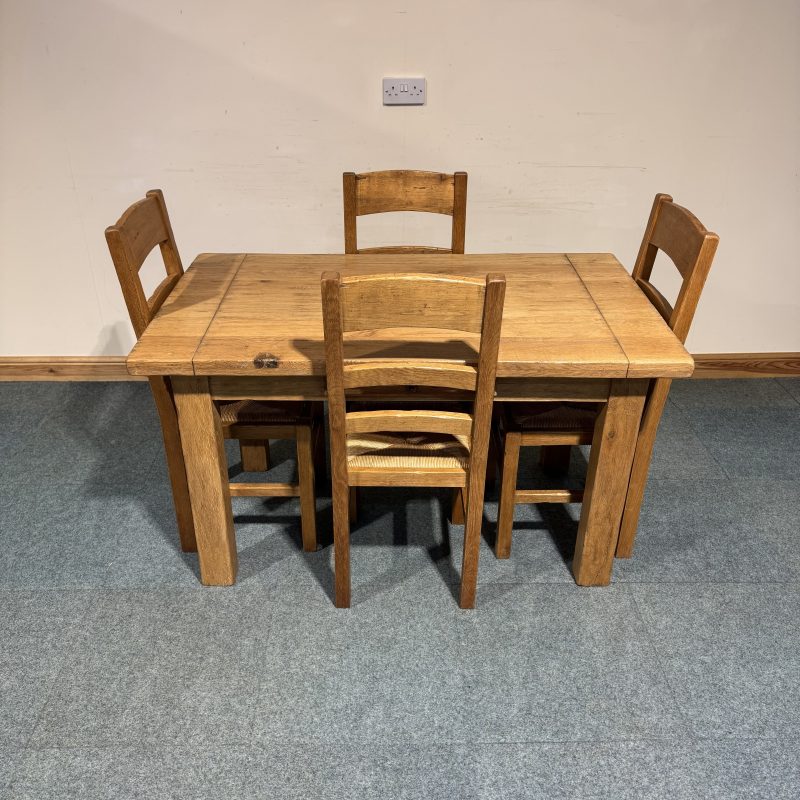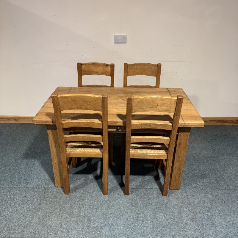 • Chairs are Solid Oak, French Distressed ladderbacks with rush seats.